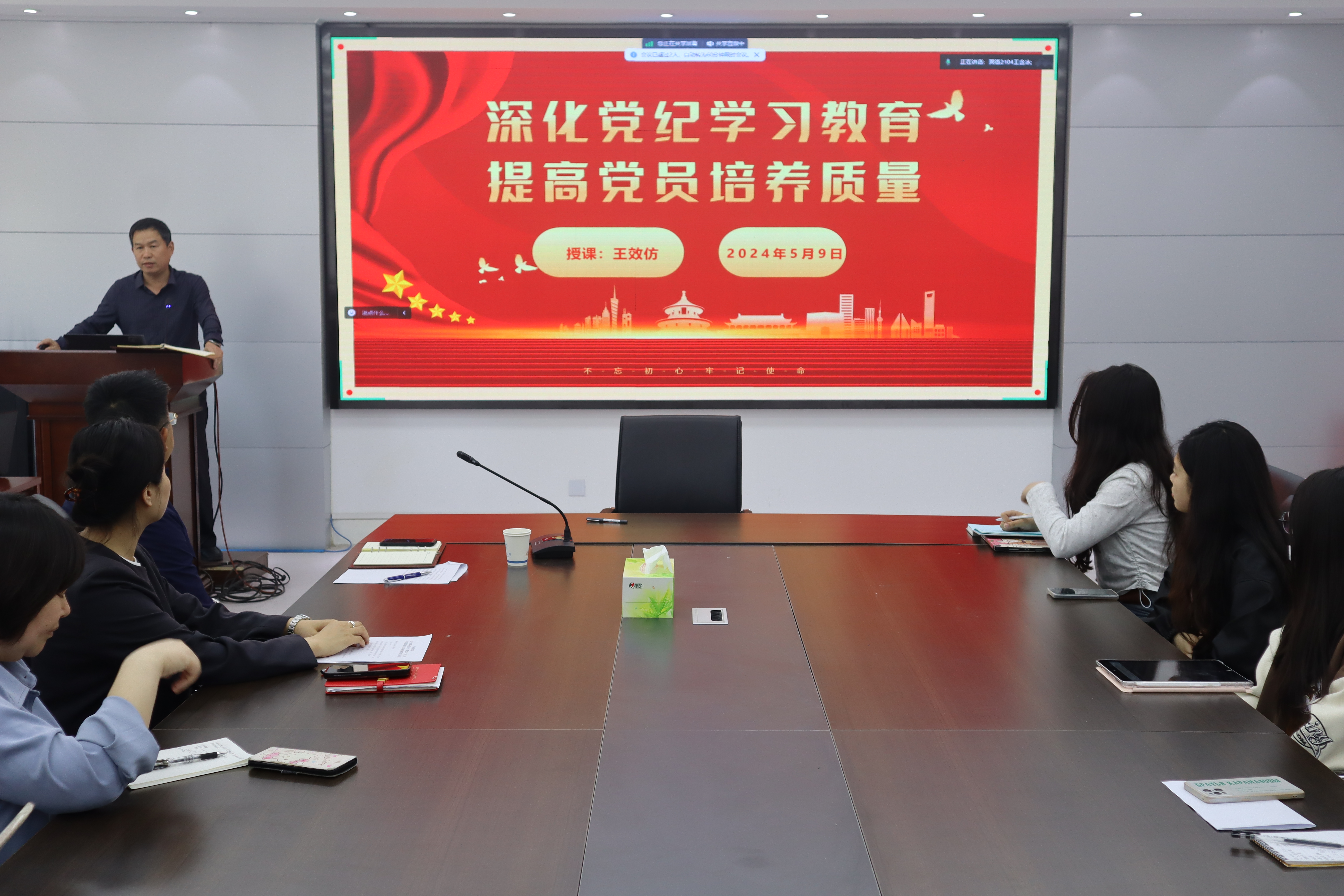 王效仿以“深化党纪学习教育 提高党员培养质量”为主题,讲授本次专题党课。王效仿向与会人员传达学习了2024年党纪学习教育的相关要求,对2023年12月修订的《中国共产党纪律处分条例》从修订的主要过程、修订的重要意义、修订亮点以及重点内容等方面进行了解读。另外,他结合学院实际,从合格大学生党员的政治思想标准、学习成绩标准、日常表现标准、社会工作标准和群众基础标准五个方面,就青年大学生如何成为新时代合格的大学生共产党党员进行了详细讲解。