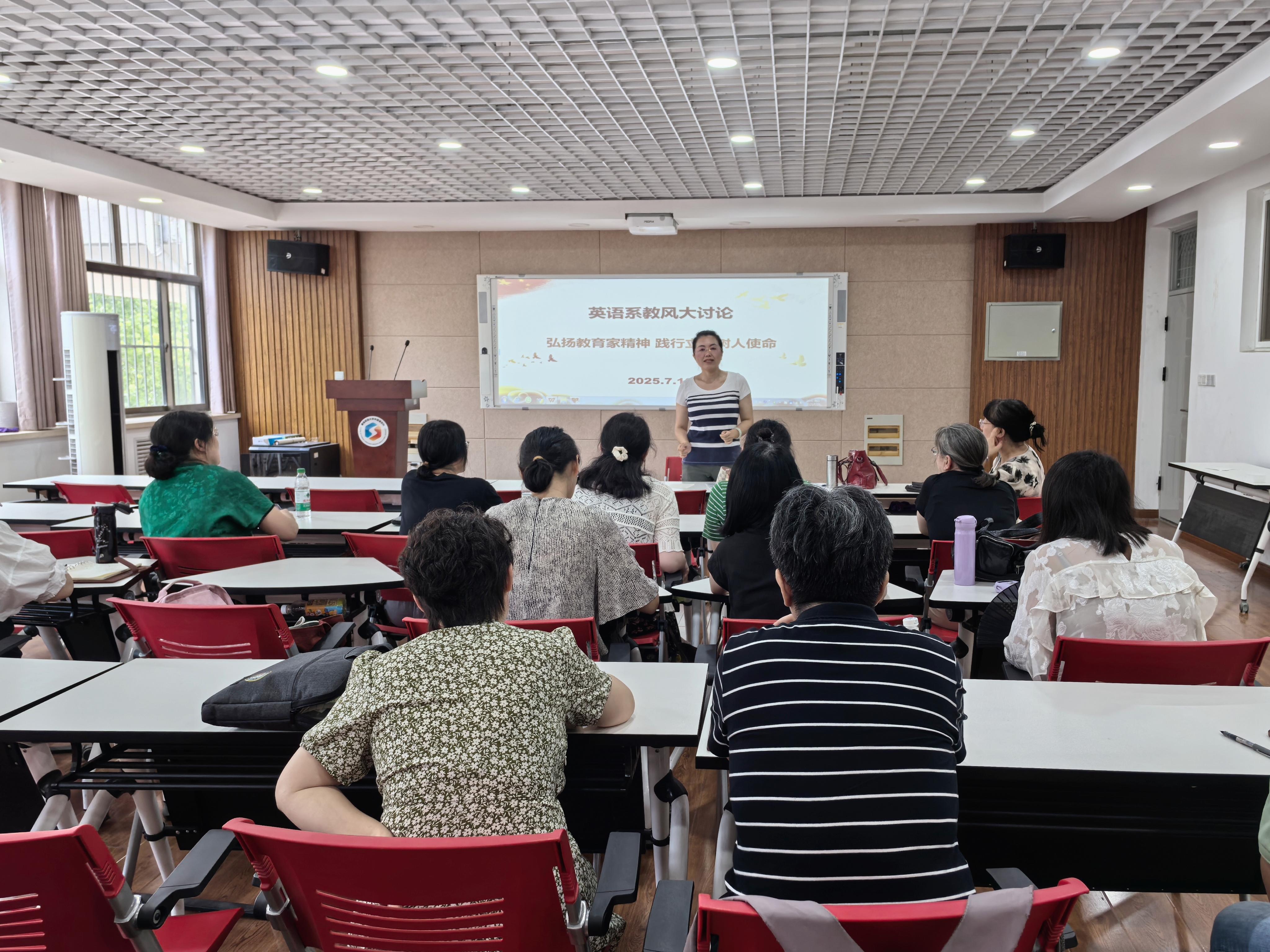 必赢net线路检测英语系于2025年7月10日召开教风建设专题研讨会,展开教风大讨论,会议以“弘扬教育家精神,践行立德树人使命”为主题,聚焦教风建设、规范落实与教学创新,老师们一起学习了习近平总书记关于“四有好老师”的重要讲话和《中共中央 国务院关于弘扬教育家精神加强新时代高素质专业化教师队伍建设的意见》等文件。结合英语学科特色,深入探讨了如何将师德师风融入跨文化沟通、语言实践等教学场景,通过优良教风涵养良好学风,树立胸怀天下、以文化人的追求,涵养启智润心、因材施教的育人智慧,不断提升育人能力与水平。