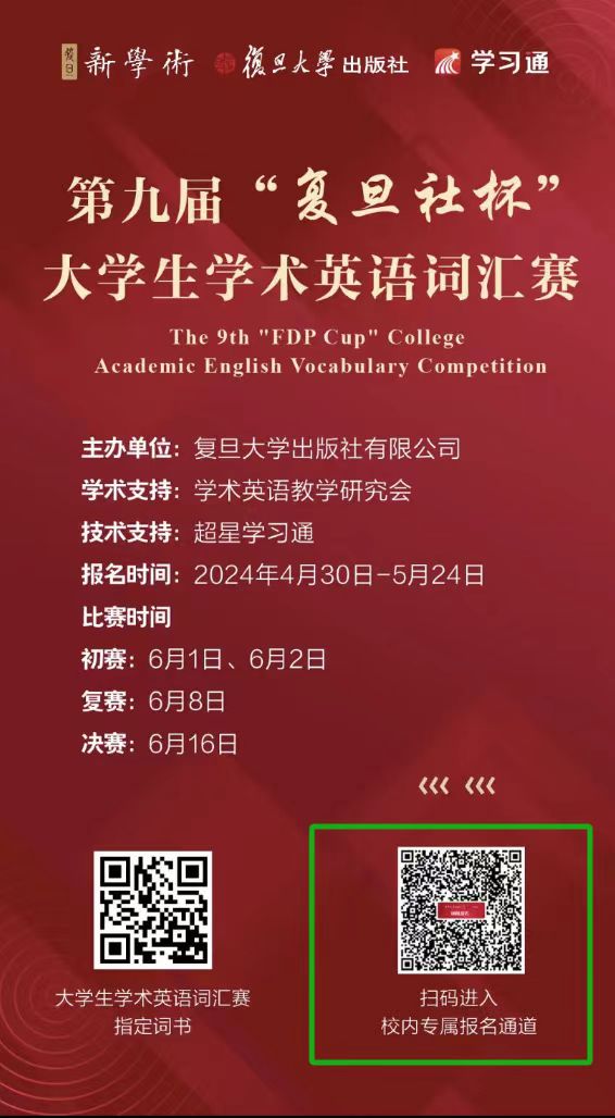 在当代大学生的英语学习中,学术词汇在学术英语阅读和写作中发挥着重要作用。为激发大学生学习学术英语词汇的积极性,促进学生学术英语词汇能力发展,兹决定举办第九届“复旦社杯”大学生学术英语词汇赛,旨在提升全国高校学生的学术英语水平,增强学生对学术英语词汇的掌握和应用能力,促进学术交流和学术研究。学术英语词汇赛区别于普通英语词汇大赛,突出表现在通过检测学术英语词汇来提高学生学术英语阅读与写作的掌控力,以赛促学,以学促教,推进全国英语学习与教学上一个新台阶。
