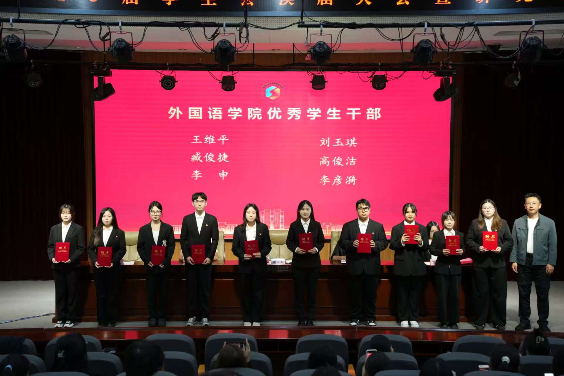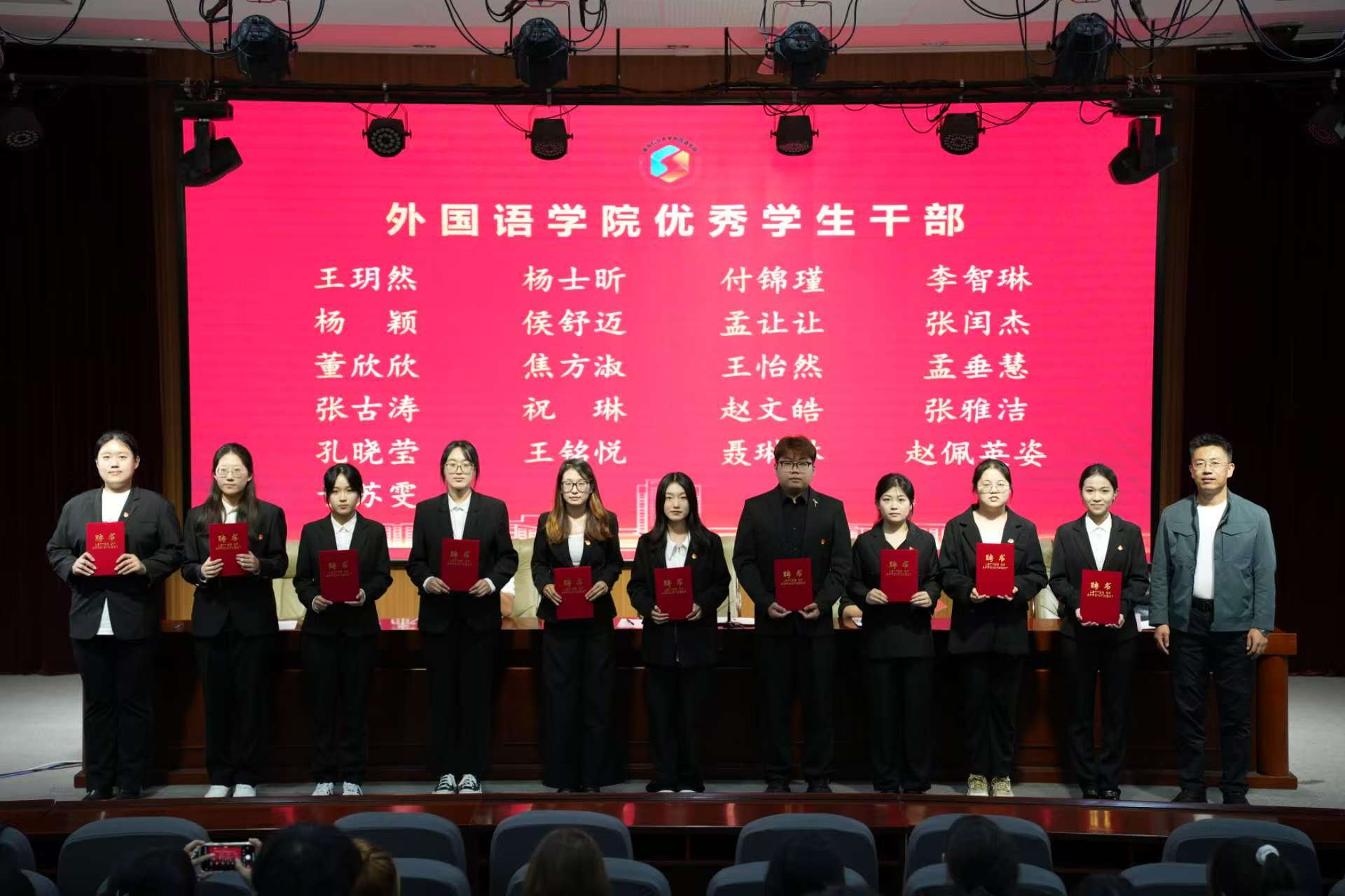 盛金玉为2024届学生会及研究生会骨干成员颁发荣誉证书。王洋洋为2024届学生会及研究生骨干成员颁发学院学生工作突出贡献奖。