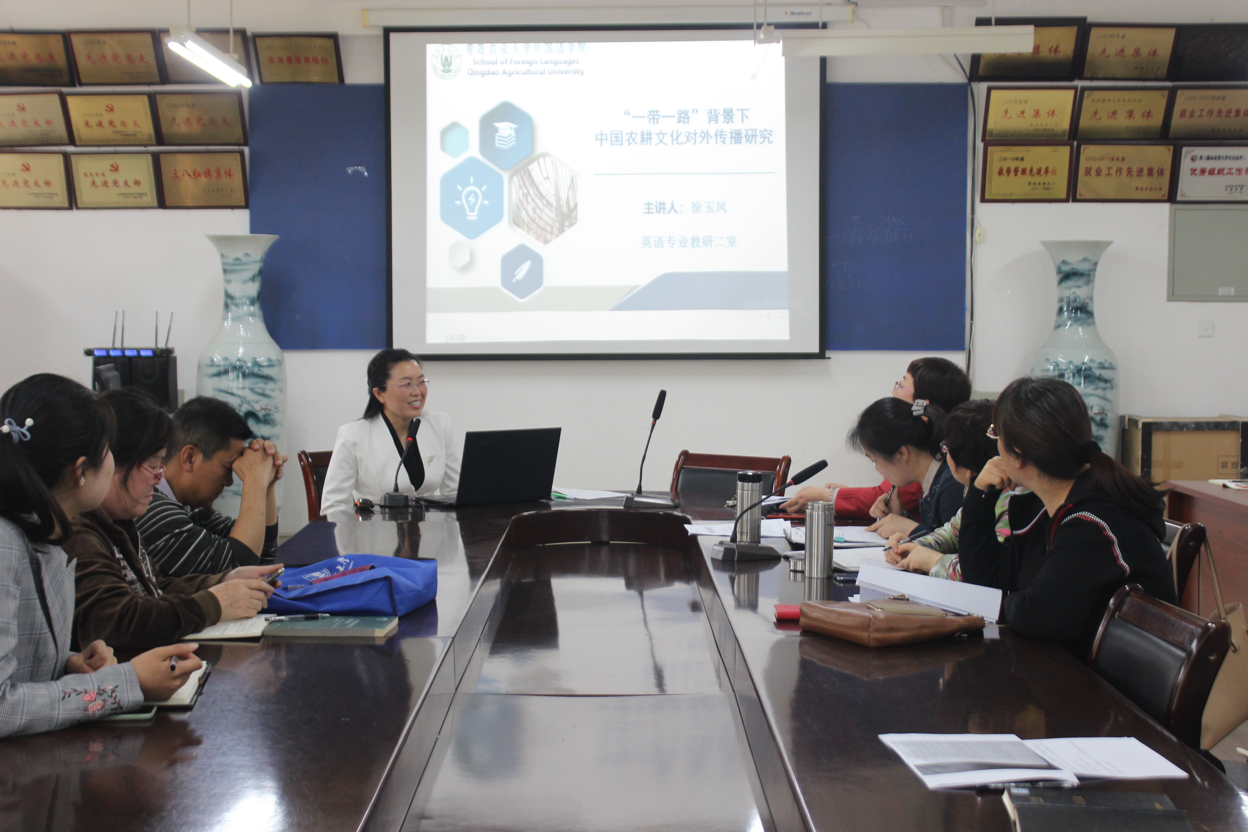 5月9日,必赢net线路检测必赢net线路检测于文经楼会议室开展外语学术论坛第三讲。此次学术论坛由徐玉凤博士主讲,主讲题目为《“一带一路”背景下中国农耕文化对外传播研究》,学院全体领导、教职工与会,副院长高秀雪主持论坛。